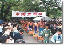 Crying Sumo (Nakizumo) End of April. Sumo wrestlers hold babies in their arms and rock them. The winner is the one whose baby cries first. In front of the Ichikawa Danjuro's statue of Gongoro in the kabuki play Shibaraku, behind Asakusa Sensoji Kannon Temple, Asakusa Station (Eidan-Ginza/Toei-Asakusa lines). Tourist Office (03) 3844-1221. Crying Sumo (Nakizumo) Late September. Amateur sumo wrestlers wearing mawashi (sumo belts) hold babies in their arms and rock them. The winner is the one whose baby cries first. Momiyama Ikiko Jinja Shrine, Momiyama Sta. (Tobu-Nikko Line from Asakusa Sta.), walk 10 minutes. Tochigi Prefecture. Kanko-ka/Sightseeing Office (0289) 64-2111. Crying Sumo (Nakizumo) September 23, Koan Jinja Shrine, Keio-Hachioji Sta. (Keio Line). Call the Shrine at (0426) 42-2550/(0426) 42-2551. Dedicatory Sumo (Hono Ozumo) Late September or early October, a sumo tournament which includes a yokozuna no dezuiri ceremony. This ceremony has been held ever since the Emperor Meiji designated sumo as the national sport. Call Meiji Jingu Shrine, Harajuku Sta. Shrine (03) 3379-5511. (URL:http://www.meijijingu.or.jp/english/intro/events/index.htm)